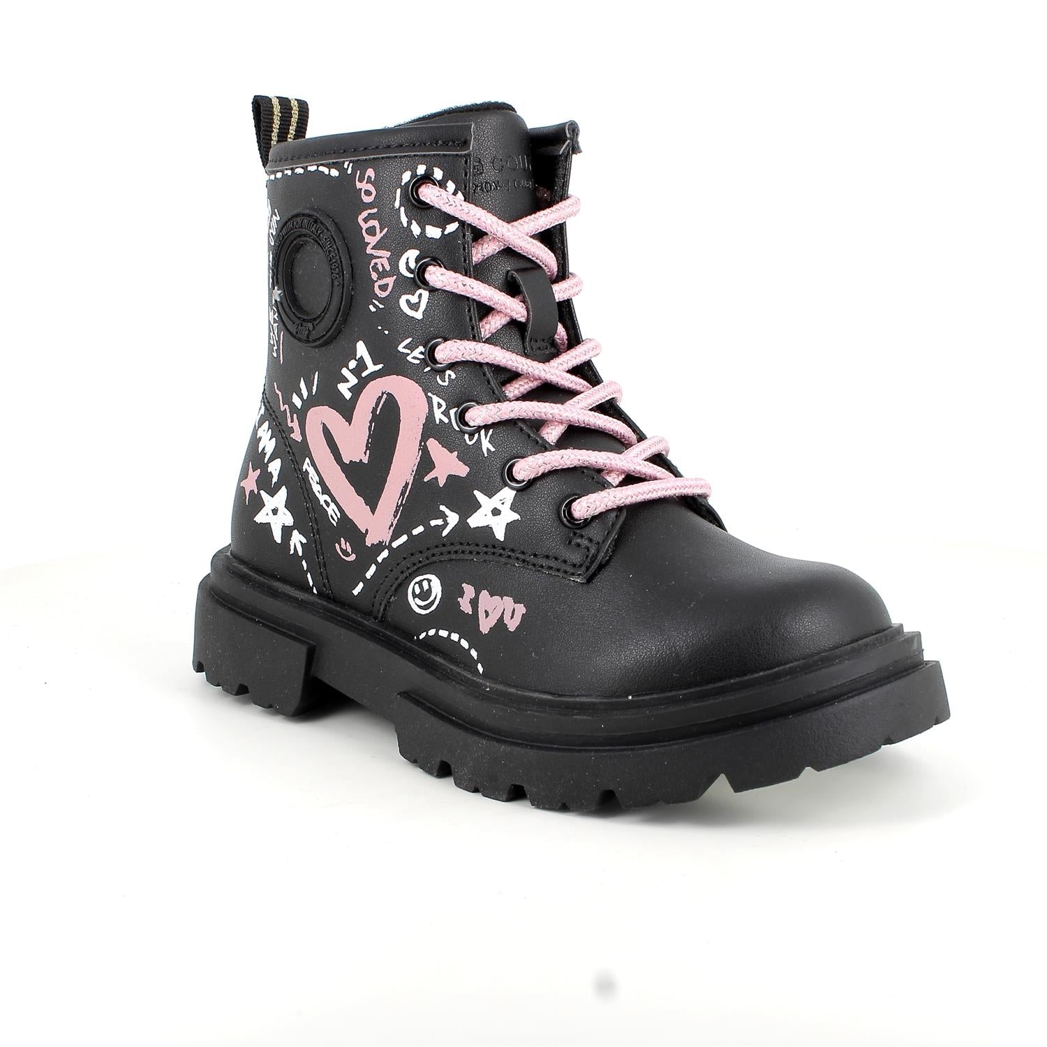 Anfibi Neri che combinano stile e funzionalità. La suola spessa unita alle decorazioni in stile graffiti cattura l'attenzione e si adatta facilmente a diversi look. Il doppio sistema di chiusura, con lacci e zip interna, facilita la calzata. Il sottopiede anatomico estraibile, rivestito in pelle, garantisce traspirabilità e igiene, favorendo il benessere del piede durante tutta la giornata.