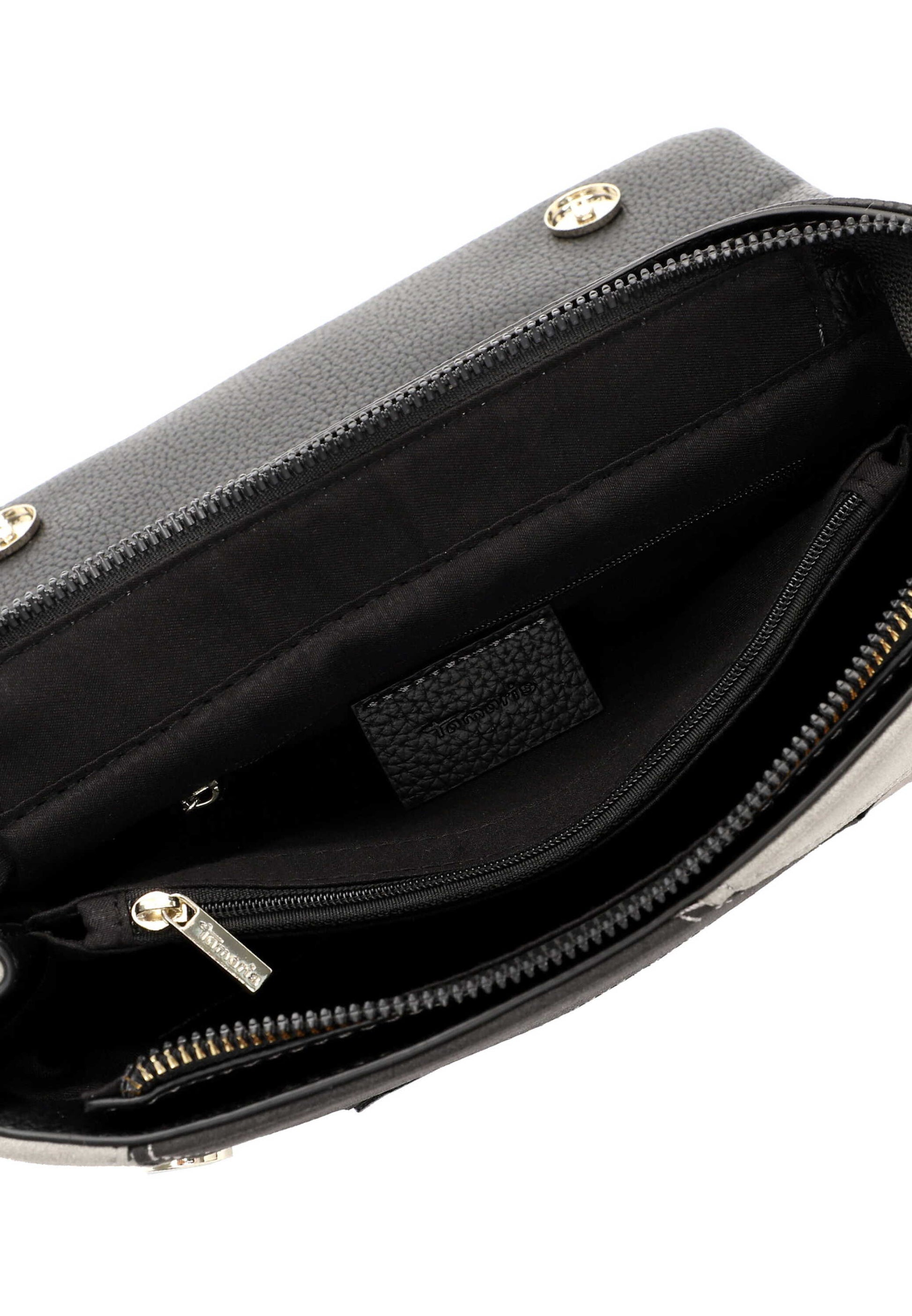Borsa a spalla in ecopelle con design patchwork geometrico che combina tonalità di nero e grigio in una composizione sofisticata e moderna. La tracolla con catena dorata garantisce praticità, mentre la chiusura a patta assicura sicurezza. Arricchita da un charm metallico con logo, questa borsa compatta si rivela versatile per ogni occasione, dal giorno alla sera. Ideale per chi ricerca un accessorio che unisce eleganza discreta e funzionalità, perfetto per completare uno stile consapevole e contemporaneo.
