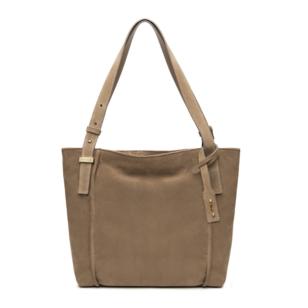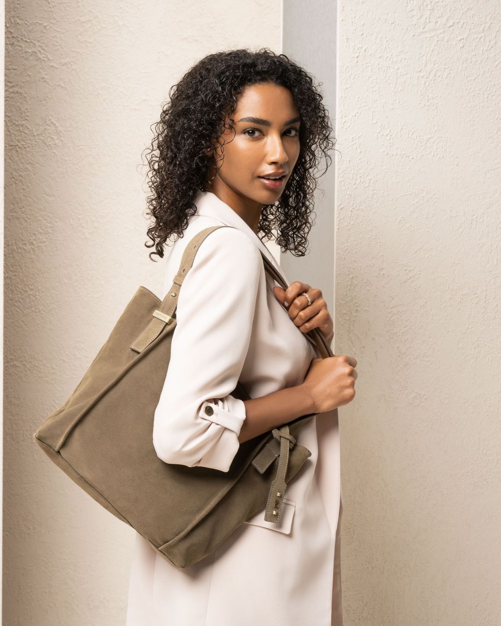 Borsa tote realizzata in morbido camoscio Tortora che combina materiali di alta qualità con tecniche di lavorazione all’avanguardia. Dalla struttura morbida con un unico scomparto interno, dotato di una tasca con zip e due taschine di servizio, questa borsa unisce funzionalità ed eleganza, offrendo un accessorio distintivo che valorizza ogni outfit con uno stile sofisticato tipico del Made in Italy.