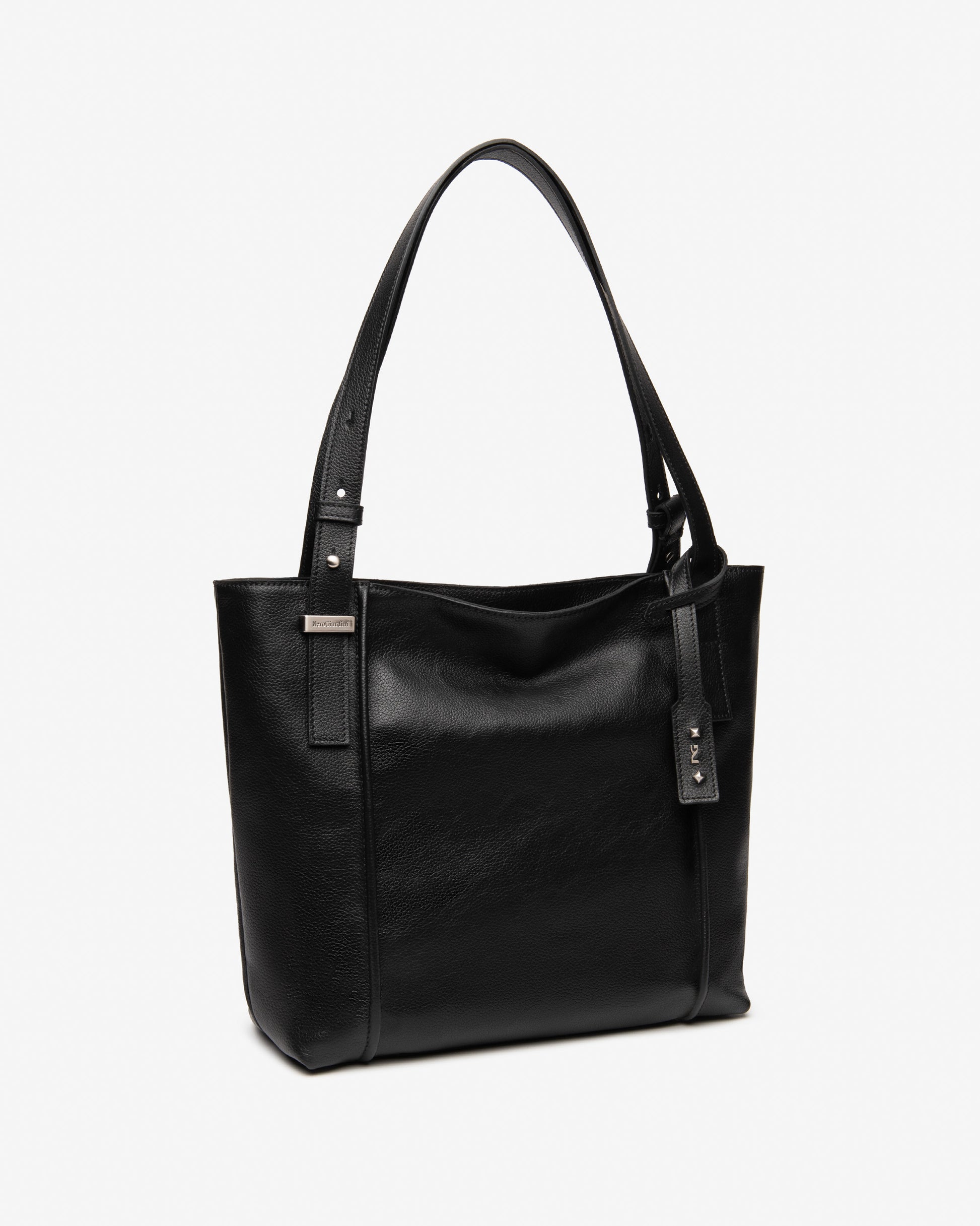 Questa shopping bag, realizzata in morbida pelle nera, unisce eleganza e funzionalità. La chiusura a zip garantisce sicurezza, mentre la struttura morbida si adatta comodamente al corpo. All’interno, l’ampio scomparto foderato con tessuto logato ospita una tasca con cerniera e due taschine di servizio, ideali per organizzare al meglio gli oggetti personali. Un accessorio raffinato e pratico, interamente Made in Italy.