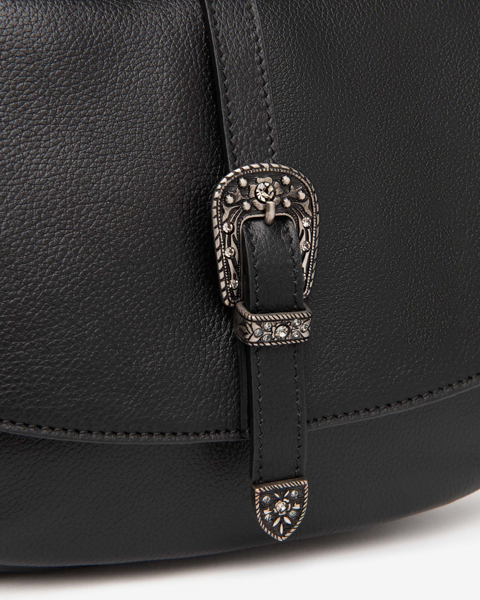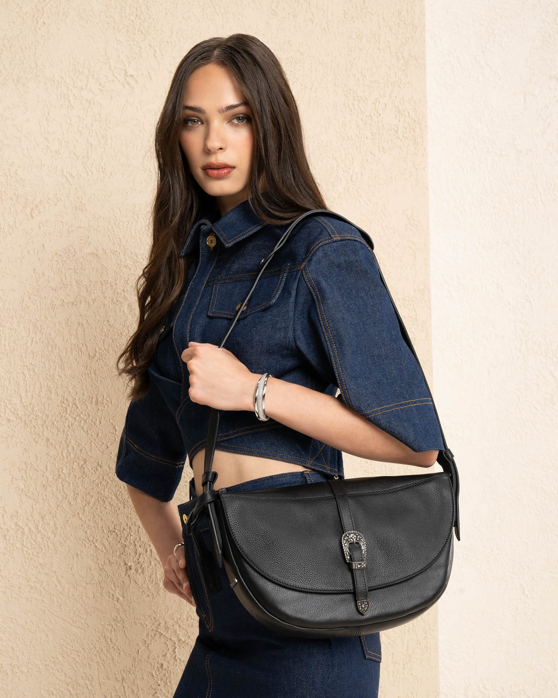 Borsa dalla struttura morbida realizzata in pelle con fibbia decorativa frontale e chiusura con bottone automatico. Unico scomparto interno foderato con tessuto logato e dotato di due ampie tasche di cui una chiusa con cerniera. Questa borsa unisce funzionalità ed eleganza, offrendo un accessorio distintivo che valorizza ogni outfit con uno stile sofisticato tipico del Made in Italy.