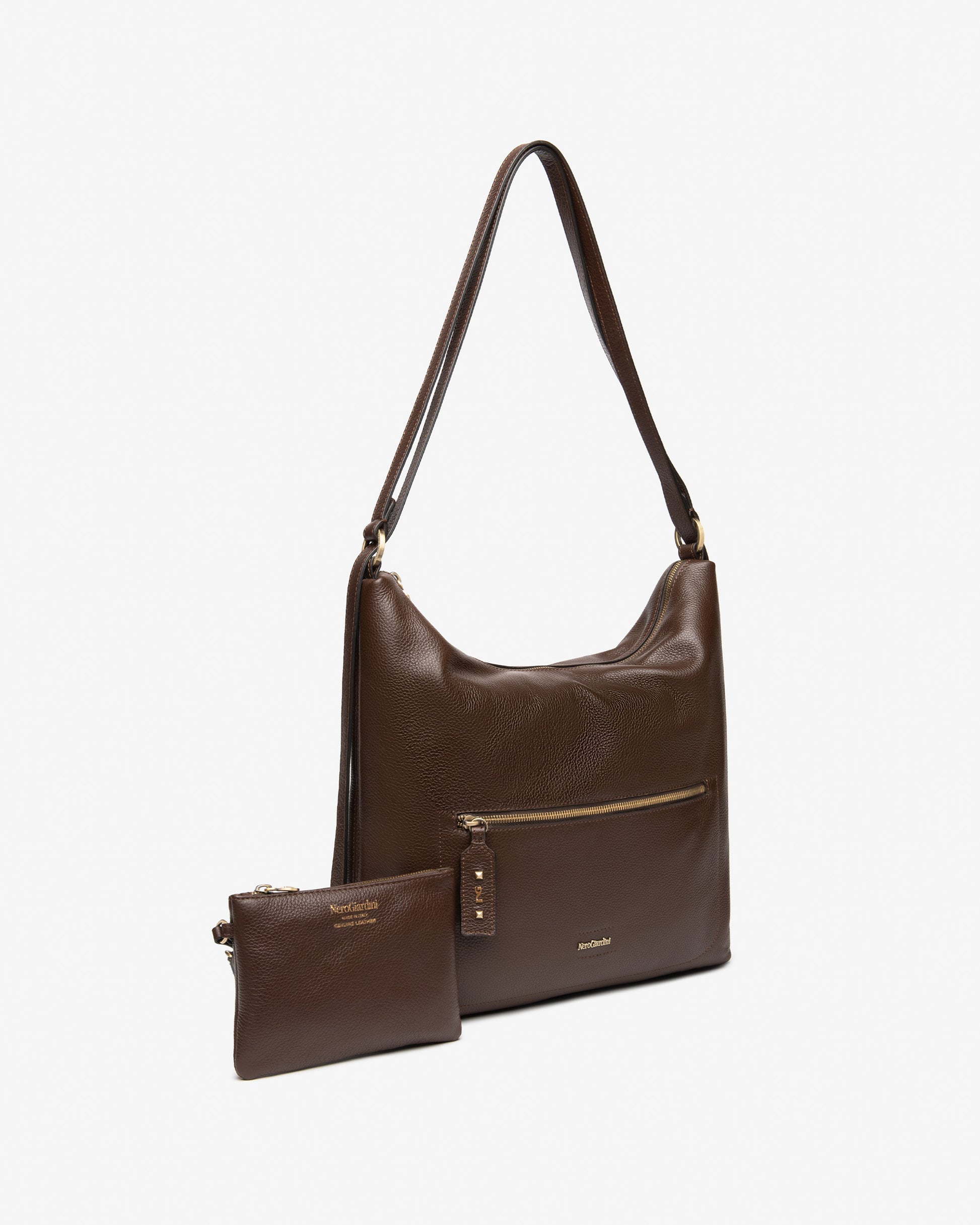 Questa borsa a spalla si trasforma in zaino semplicemente tirando le maniglie, offrendo versatilità e comfort. Realizzata in pregiata pelle martellata, presenta un interno spazioso con unico scomparto e una bustina di servizio rimovibile per organizzare al meglio gli oggetti personali. La pratica tasca anteriore esterna con cerniera garantisce un accesso rapido, mentre il piccolo logo metallico frontale aggiunge una raffinata eleganza al design. Un articolo funzionale e sofisticato, perfetto per chi cerca stile e adattabilità. Made in Italy