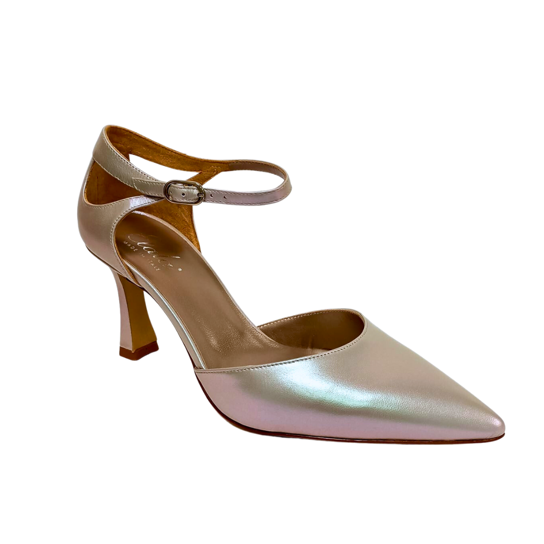Scarpa elegante dalla punta sfilata in pelle perlata. Fodera e sottopiede in pelle. Fondo in vero cuoio con tacco foderato di 7 cm. Manifattura artigianale Made in Italy